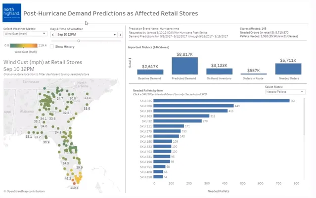 Este dashboard es un ejemplo que está monitoreando una predicción de demanda en tiendas de retail por producto después de que haya pasado un huracán